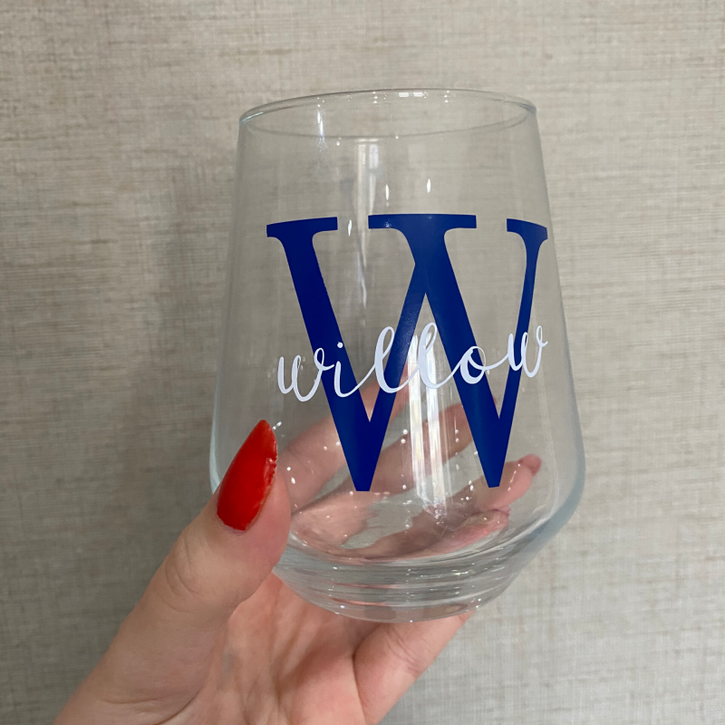 About: Personalised clear glass tumbler made to order. Capital letter with name across.